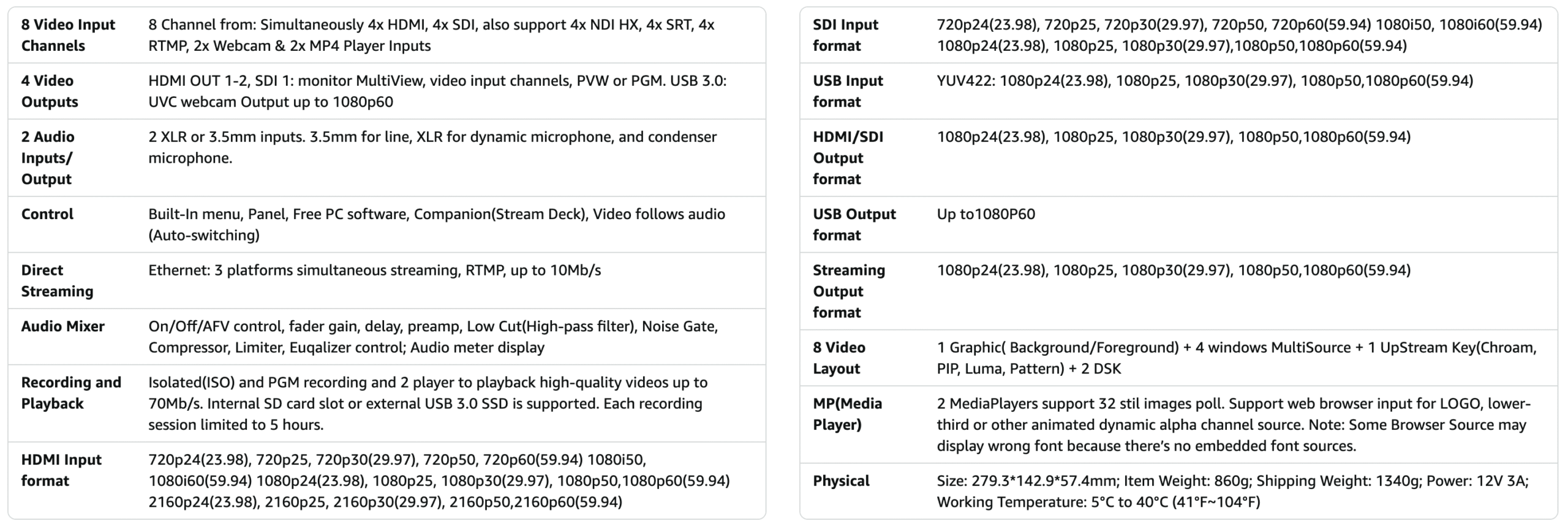 4 × HDMI, 4 × SDI, SSD or SD Card play-back, USB Camera, NDI HX can be connected to the device simultaneousl